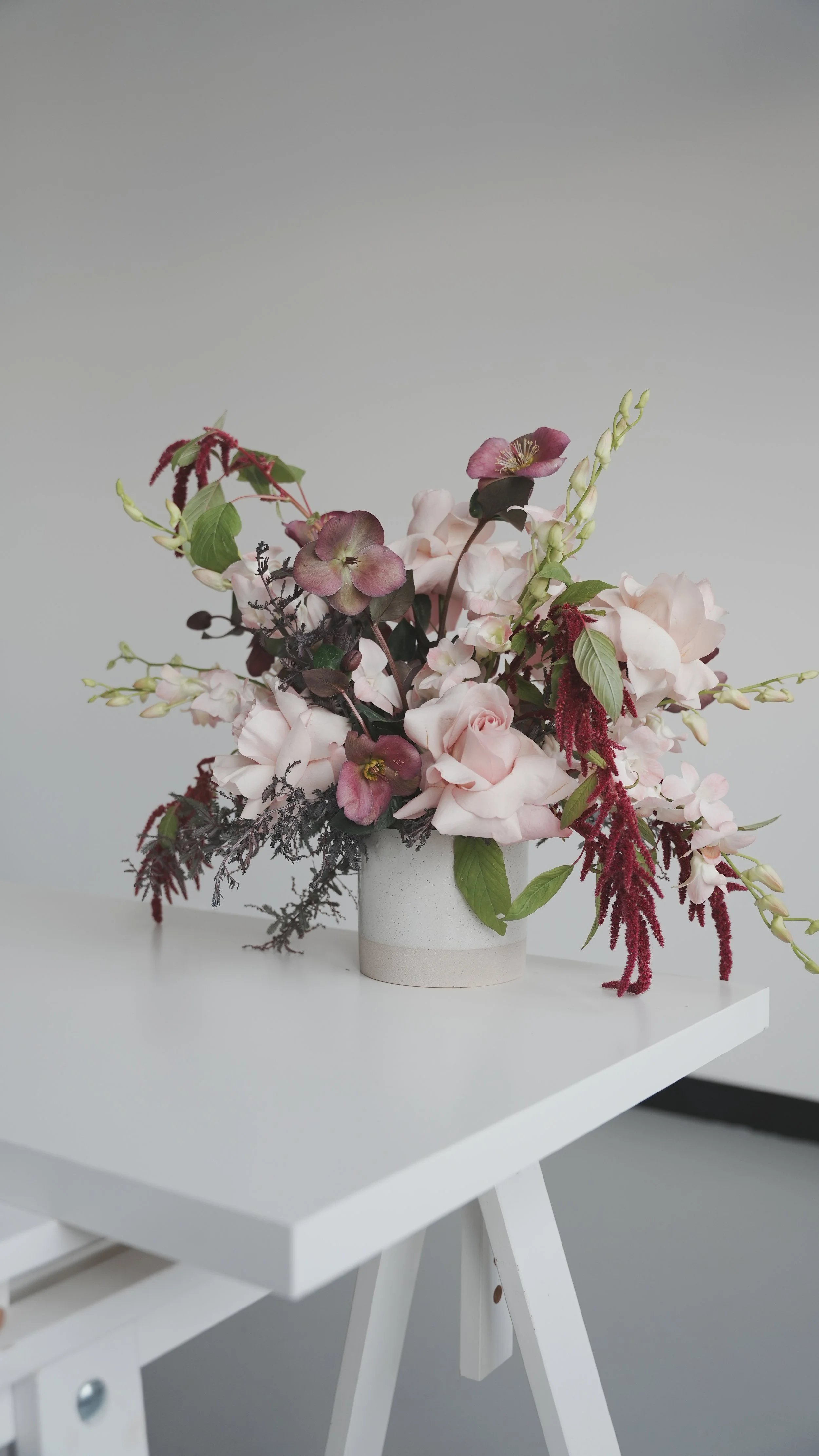 Our version of romance is soft, sculptural, and a little wild. This composition features roses, orchids, hellebores, and hanging amaranthus arranged in a vase. Pictured is the $200 size option.